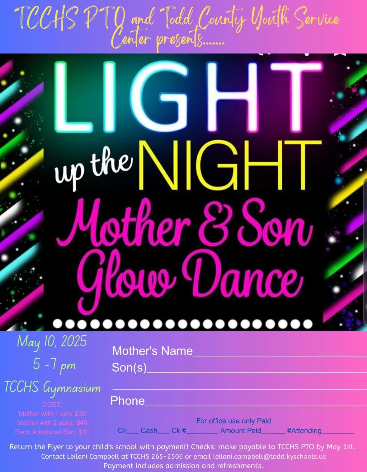TCCHS’s Parent Teacher Organization (PTO) and Todd County Schools’ Family Resource and Youth Service Centers (FRYSC) are teaming up to host the third annual “Light Up the Night” Mother and Son Glow Dance at TCCHS Saturday, May 10.