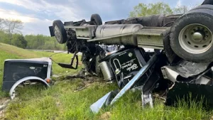 Trigg County Sheriff’s Deputy Ryan Gallogly says the tanker that was driven by Scot Blake was eastbound when a tire blew out causing the truck to run off the road and travel through the median coming to a stop in the westbound lanes after overturning several times.