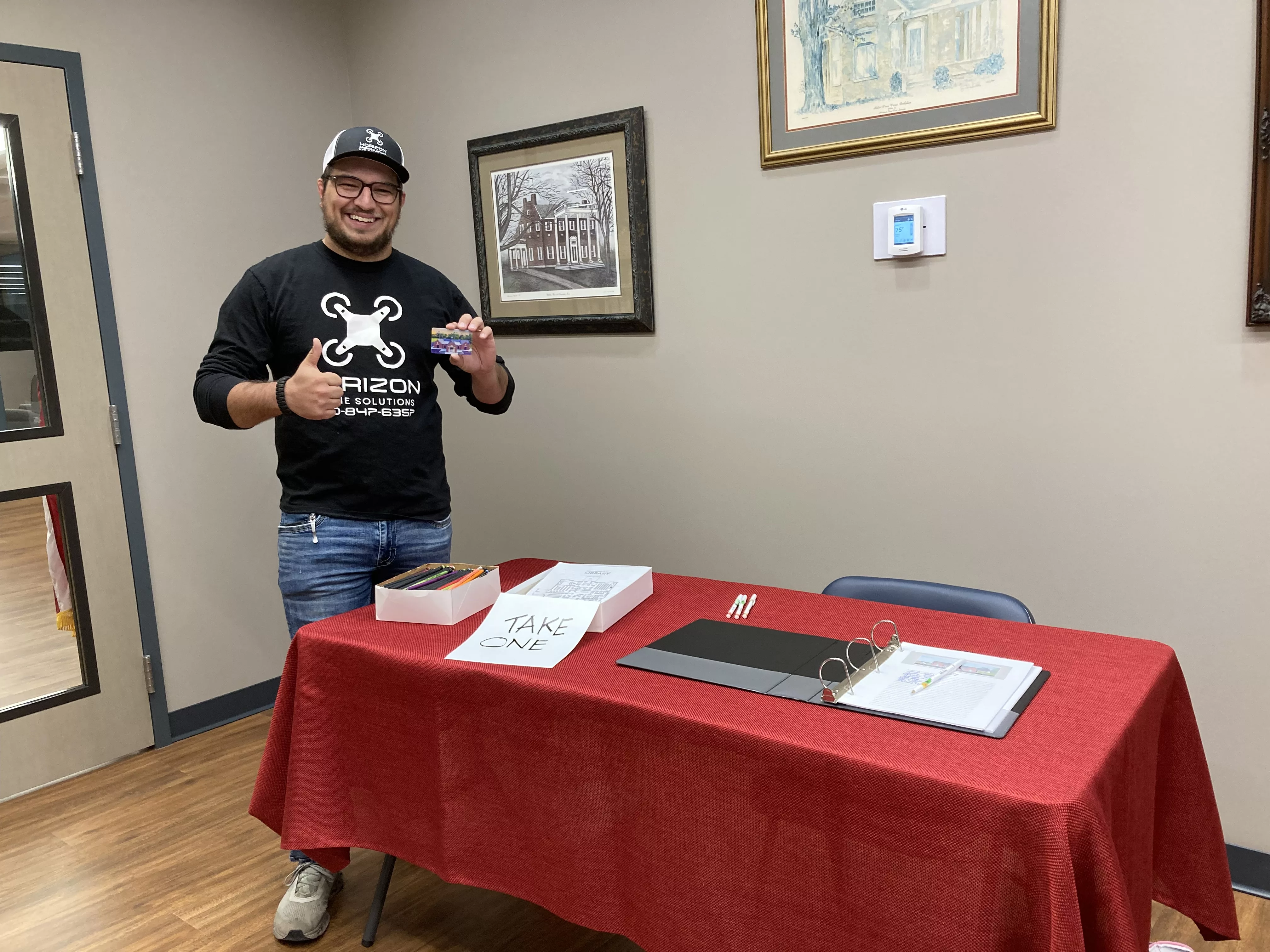 One very interesting conversation on Monday occurred with Kyle DeBerry, owner of Horizon Drone Solutions. Kyle, who completed drone pictures of the library following its construction and during the move from the “old” library to the new structure, shared that as a youngster “going to the library” was a treat he and his younger brother loved dearly. He stated when he was told they could chug to the library that it was like receiving a special treat since their “special treats” had to be inexpensive ones. Kyle was one of the first patrons to arrive on Monday, and one of his first stops was at the circulation desk so that he could receive a new library card. Again, what was such a “special treat” for Kyle on Monday was that one of his drone pictures of the new library is now the face of the new library card. That indeed is such a special reminder to a young man whose love for a library has been nurtured from a young age.