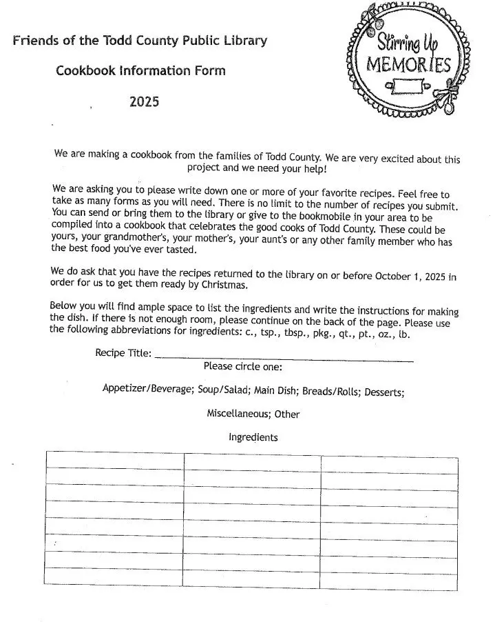 The Friends of the Todd County Library organization is creating a community cookbook and asks the community to submit some of their favorite recipes.