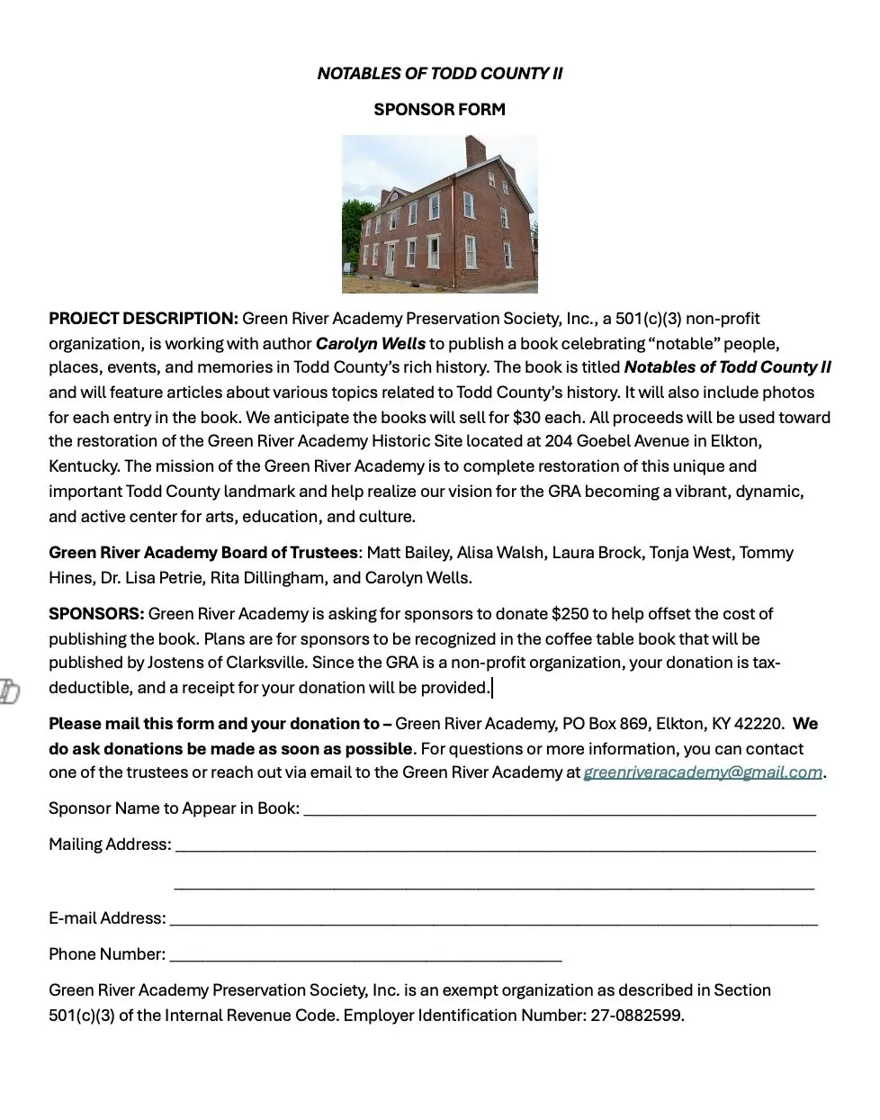 The Green River Academy is currently seeking sponsors for Todd Countian Carolyn Wells’ newest book, “Notables of Todd County II.”