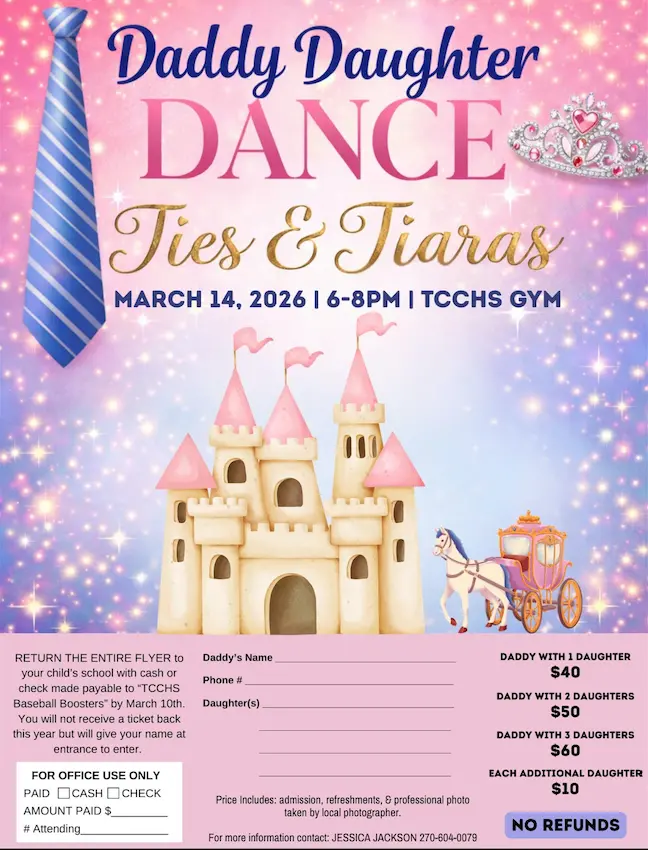 Forms have already been sent home to students. The flyer and payment is due back to the student’s school by Tuesday, March 10. Cash or check is accepted, and checks should be made payable to “TCCHS Baseball Rosters.” This year, no tickets will be distributed. Fathers and daughters should give their names at the event entrance.