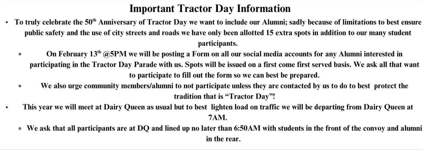 - Redneck vs. Rodeo Dress-up Wars and the 50th annual TCCHS FFA Tractor Day on Friday, February 27th