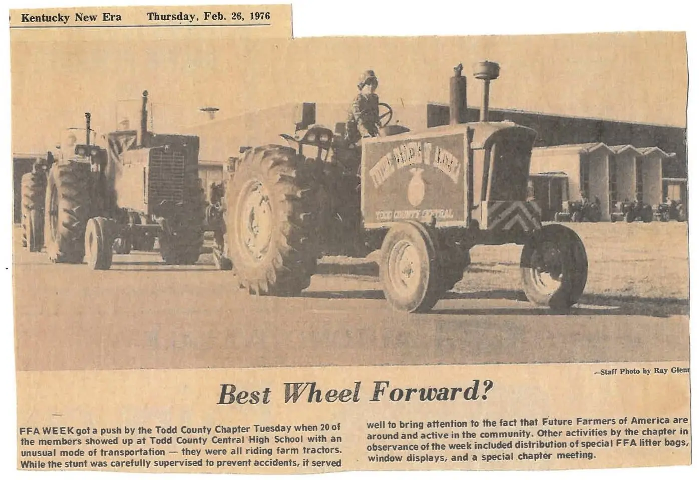 Notably, one of those recurring memories folks tend to reflect upon and discuss is the traditional FFA Tractor Day that had its genesis at TCCHS back in February of 1976, almost 200 years following the birth of the United States of America in July of 1776. For those not knowledgeable about “FFA,” the three letters refer to the national farming organization dubbed with the name “Future Farmers of America.” Since the USA, Kentucky, and Todd County are well known for agriculture, it is only fitting a farming community and a high school recognized for creative student activities embraced this event during the 1976 celebration of National FFA Week.