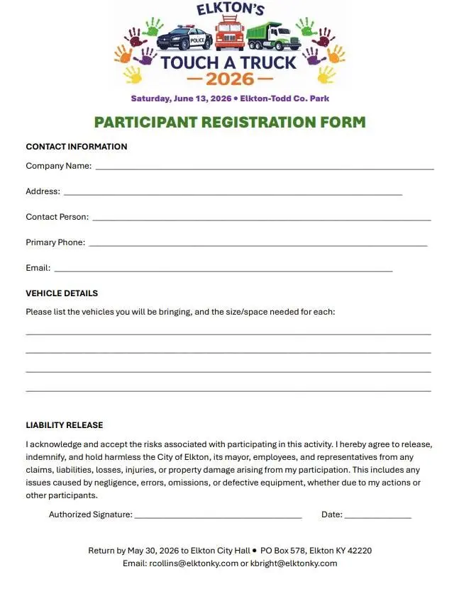 Forms may be submitted to rcollins@elktonky.com, mailed to PO Box 578, Elkton, KY, 42220 or dropped off at Elkton City Hall.